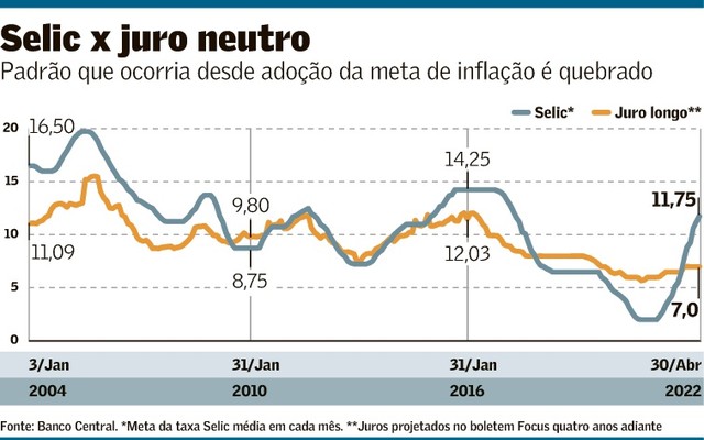 O juro neutro embutido nas projeções do boletim Focus se descolou ultimamente da meta da taxa Selic, quebrando um padrão que vinha ocorrendo desde a adoção do regime de metas de inflação no Brasil.