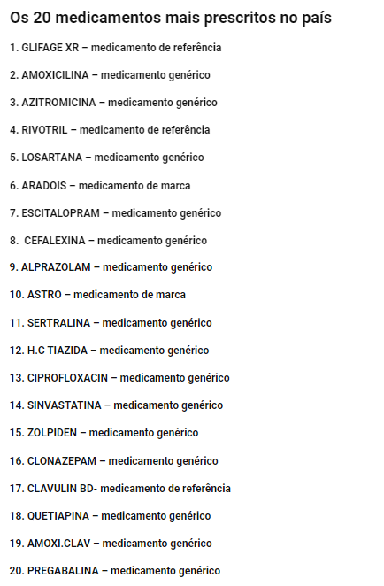 A lista de 20 medicamentos mais prescritos no país inclui 15 genéricos. É o que aponta uma análise da Close-Up International, que confirma a consolidação dessa categoria cuja implementação no Brasil completa 24 anos.