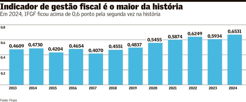O IFGF, elaborado pela Federação das Indústrias do Estado do Rio de Janeiro (Firjan), analisou as contas de 5.129 municípios com base em dados declarados pelas prefeituras. Juntas, essas cidades representam 200,5 milhões de pessoas, ou 95,6% da população brasileira. Como resultado dessa “era de ouro” das receitas, o IFGF atingiu 0,6531 pontos, o maior da série histórica, iniciada em 2013. Foi a segunda vez que o IFGF ficou acima do 0,6 ponto, piso para a gestão da cidade ser considerada “boa” – em 2022 o IFGF havia sido de 0,6249.