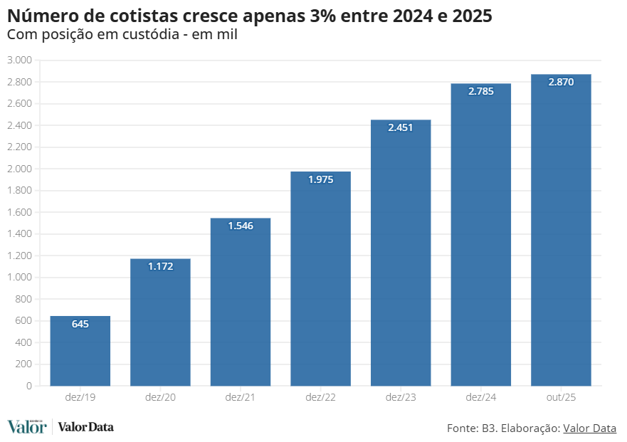 Entre 2019 e 2025, o número de cotistas saltou de 645 mil para 2,87 milhões, um crescimento de 345%, que consolidou a indústria como uma das principais portas de entrada em investimentos de risco no país. Na comparação ano a ano, no entanto, a fotografia mostra um cenário de forte desaceleração de novos investidores.