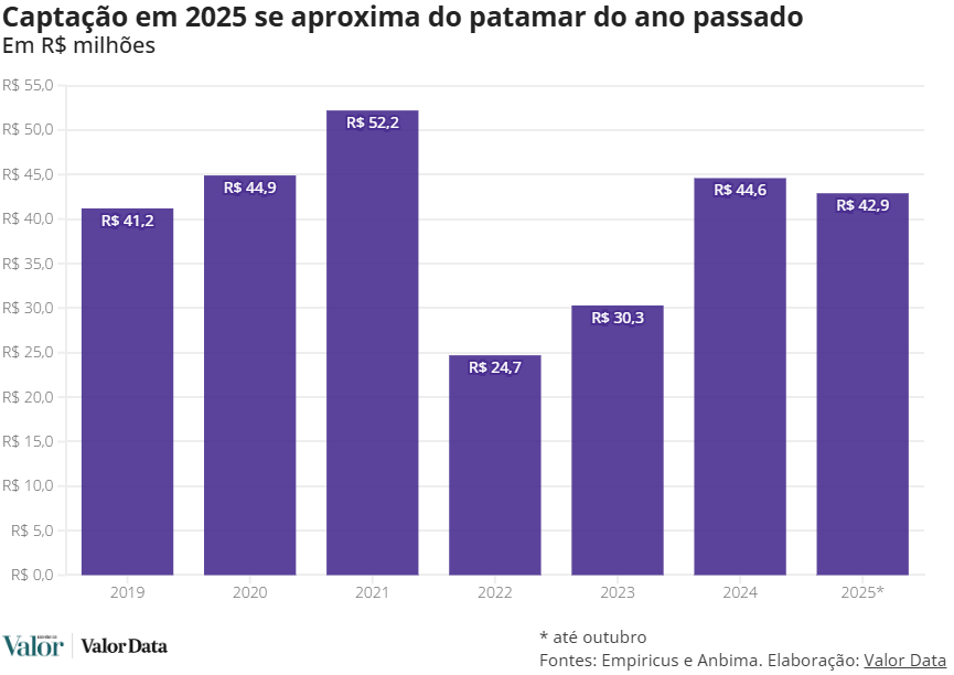 Em termos de captação, o setor já levantou R$ 42,9 bilhões neste ano até o início de novembro, um volume que praticamente encosta nos R$ 44,6 bilhões captados em 2024. O ano começou fraco, com emissões escassas e investidores retraídos, mas a recuperação recente recolocou o mercado em um patamar semelhante ao do ano anterior. De qualquer forma, essa cifra está distante do auge de 2021, quando a indústria captou R$ 52 bilhões, mas também longe do colapso de 2022, quando o volume caiu pela metade.