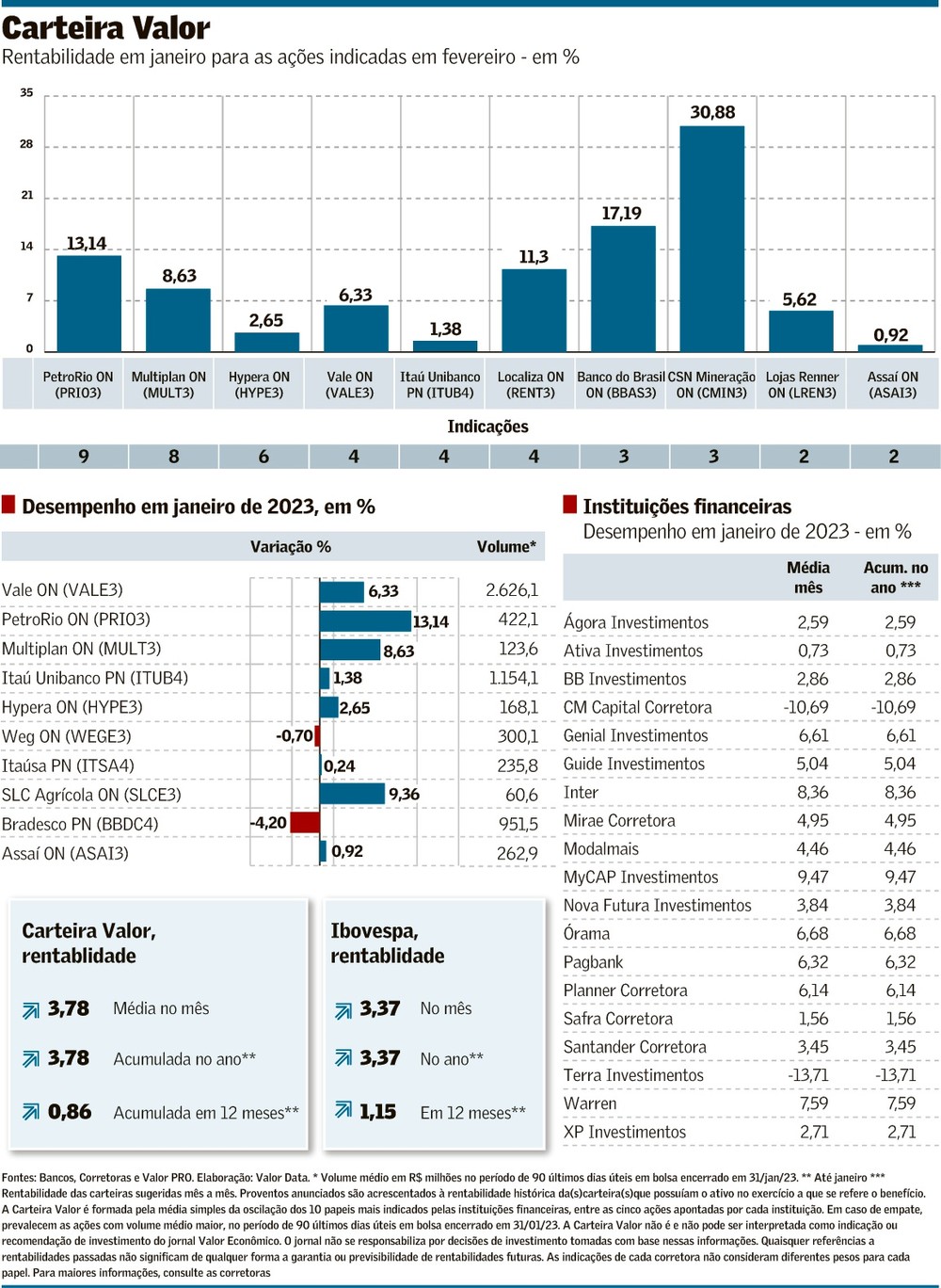 Em janeiro, a Carteira Valor subiu 3,78%, enquanto o Ibovespa teve alta de 3,37%. No ano passado a Carteira Valor se valorizou 6,11% e o principal indicador de referência da bolsa brasileira subiu 4,69%.