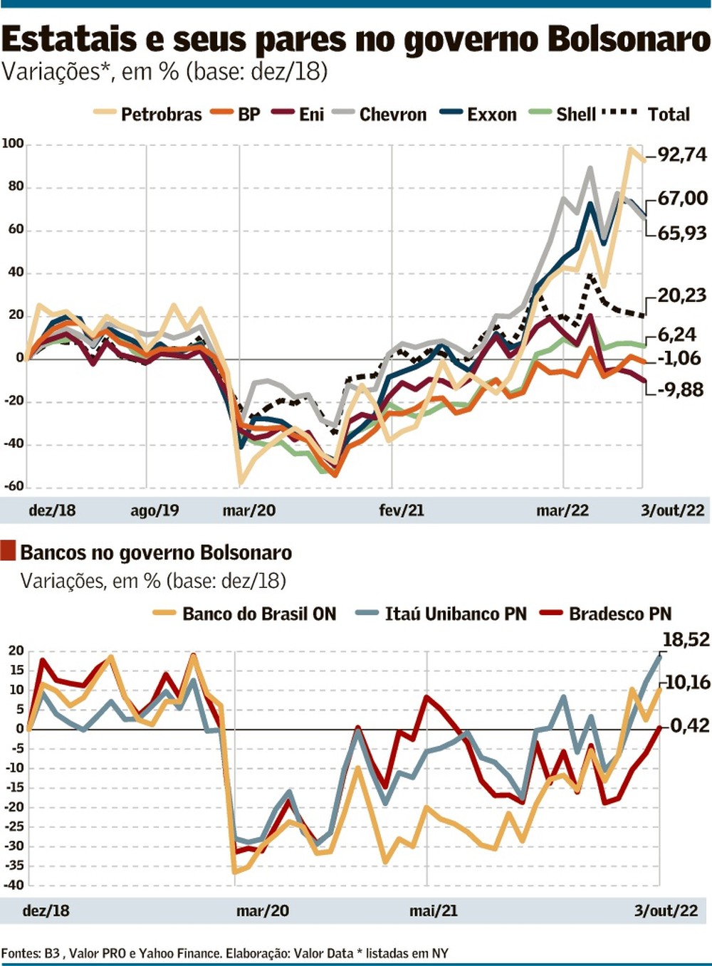 Entre os papéis da “cesta Bolsonaro” se destacaram Petrobras e Banco do Brasil. As ações preferenciais da petrolífera subiram 7,99% e as ordinárias, 8,63%. Já os papéis do banco público avançaram 7,63%, ganho maior do que o das instituições financeiras privadas. No ano, as empresas também têm performance semelhante ou até superior aos seus pares, mesmo após turbulências com a atual gestão federal.