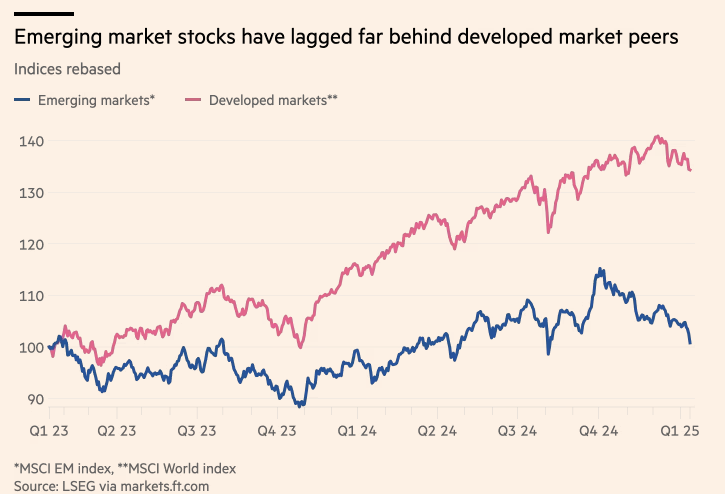 Os investidores agora apostam que os países tentarão enfraquecer suas moedas para tornar suas exportações mais competitivas em resposta às tarifas dos EUA, uma medida que reduziria os lucros em dólar dos mercados emergentes.