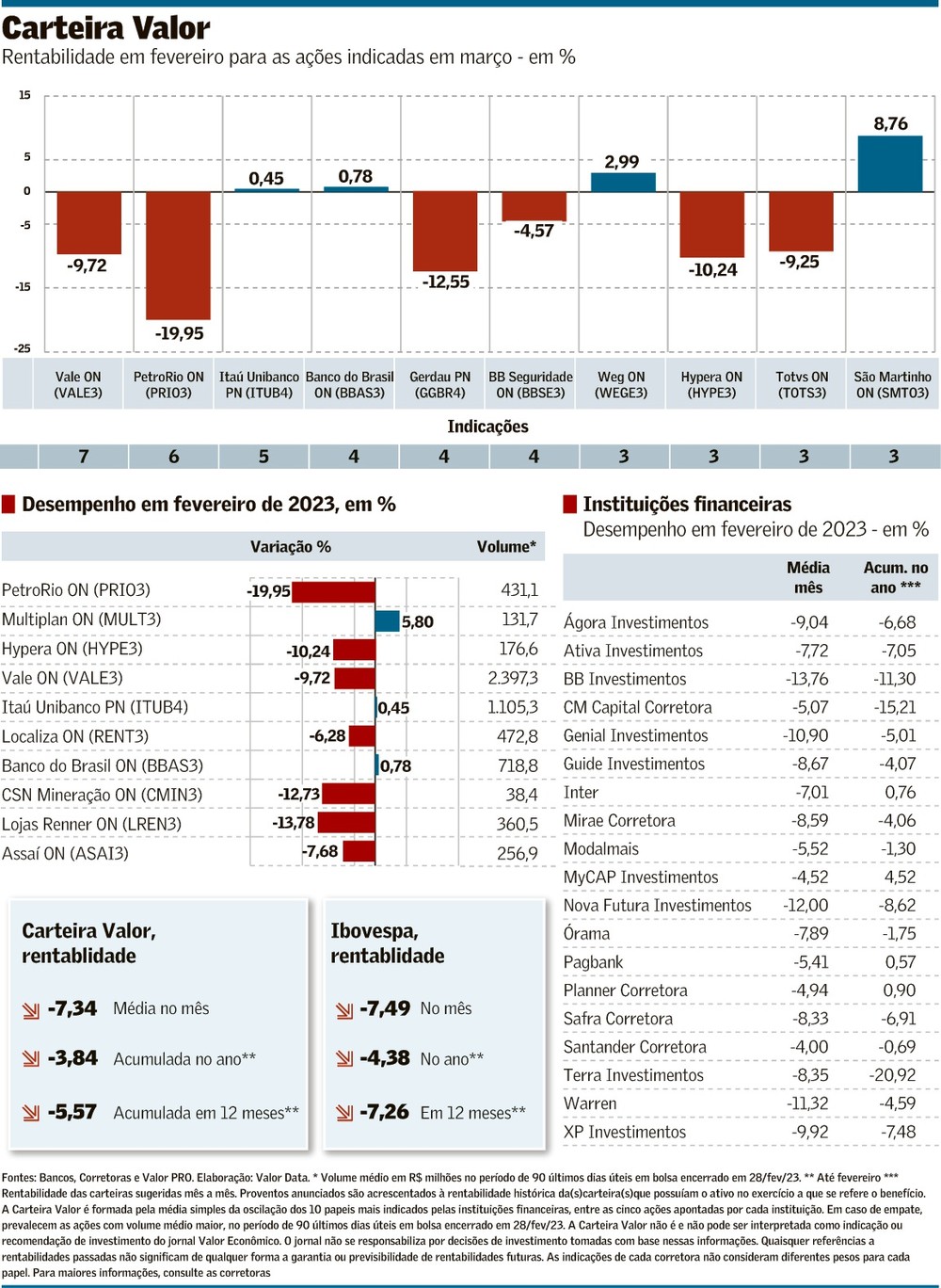 Em fevereiro, a Carteira Valor caiu 7,34%, enquanto o Ibovespa teve uma queda de 7,49%. No ano até fevereiro, a Carteira Valor perdeu 3,84% e o principal indicador de referência da bolsa recuou 4,38%. Em 12 meses até fevereiro, a Carteira Valor acumula queda de 5,57% e o Ibovespa, de 7,26%.