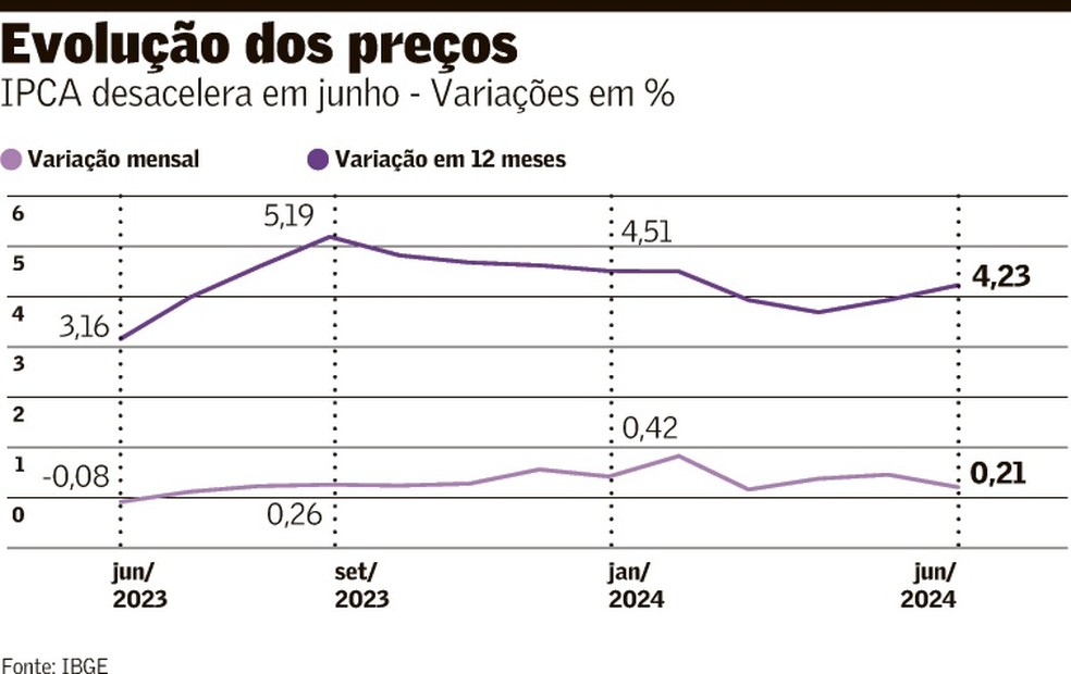 Em 12 meses, o indicador aceleraou de 3,93% para 4,23% em junho. Já o acumulado do ano chegou a 2,48%. Em igual período de 2023, a inflação acumulada foi de 2,87%.