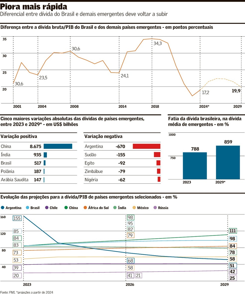 Até 2026, a diferença entre a dívida do Brasil e demais emergentes deve subir para 22,4 pontos. Ela deve ficar praticamente estável em 2027 (22,3 pontos) e desacelerar para 21,5 pontos em 2028 e 19,9 pontos em 2029. Ainda assim, a dívida brasileira, que representava 788% do valor médio da dívida dos emergentes em 2023, deverá representar 859% em 2029, horizonte até o qual o FMI tem projeções.