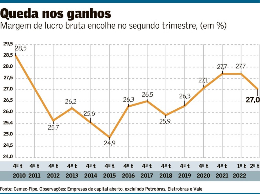 A política monetária restritiva no país começa pesar sobre as despesas financeiras das companhias. Esse fator, somado à expectativa de redução do crescimento econômico e de recessão em economias desenvolvidas, deve reduzir as margens das empresas de capital aberto nos próximos trimestres, após uma recuperação aos níveis pré-pandemia. É o que mostra estudo produzido pelo Centro de Estudos de Mercado de Capitais (Cemec-Fipe).