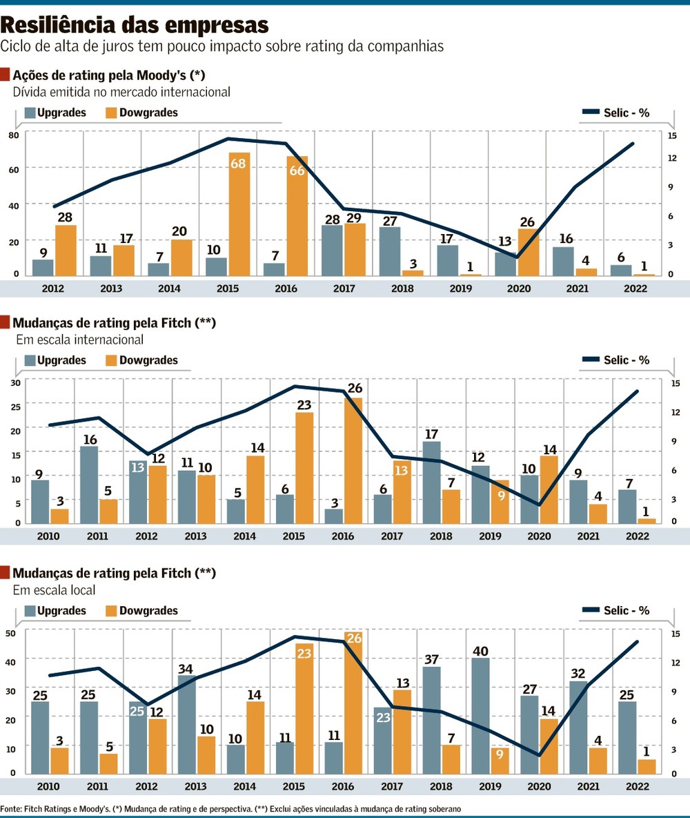 Segundo levantamento feito pelas agências Fitch e Moody’s, o número de movimentos negativos no rating das companhias é bastante reduzido. No caso da Fitch, nos últimos dois anos, período em que ocorreu o ciclo de alta de juros, sofreram “downgrade” cinco empresas, quatro delas em 2021 (Eldorado, Andrade Gutierrez Engenharia, General Shopping e USJ) e uma neste ano (Hidrovias), na avaliação em escala internacional da dívida emitida no mercado brasileiro por empresas não financeiras.