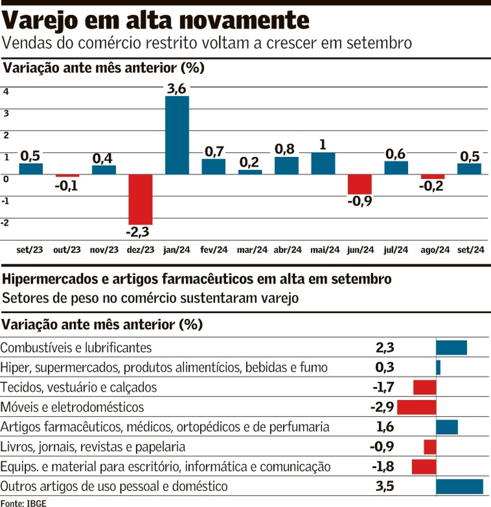 O volume de vendas no varejo restrito cresceu 0,5% em setembro, ante agosto, com ajuste sazonal, segundo a Pesquisa Mensal do Comércio (PMC), divulgada ontem pelo IBGE. Em agosto, frente a julho, o comércio restrito havia caído 0,2% (dado revisado após divulgação de queda de 0,3%). No conceito ampliado, que inclui vendas de veículos e motos, partes e peças, material de construção e atacarejo, o volume de vendas subiu 1,8%.