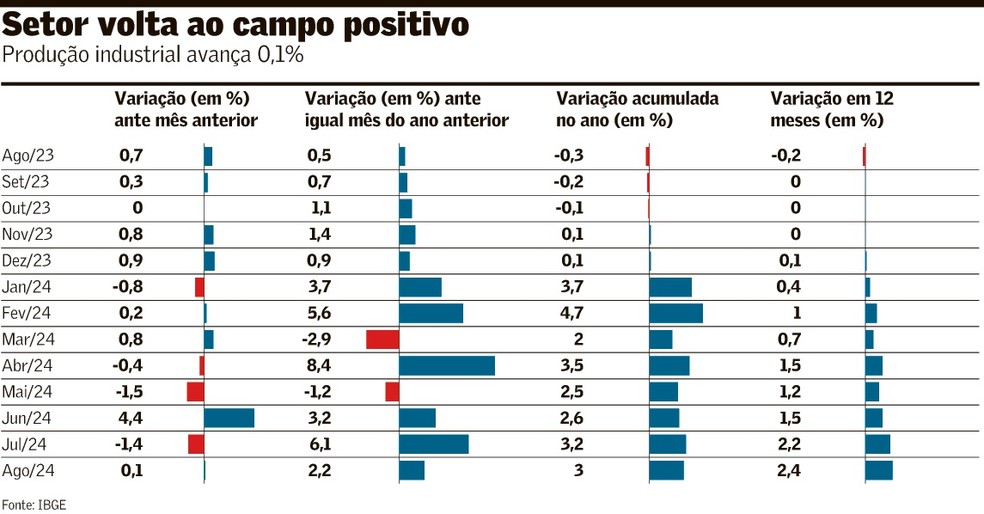 O desempenho de agosto ficou na mediana das estimativas de 25 instituições financeiras e consultorias ouvidas pelo Valor Data. Em 12 meses até agosto, a indústria acumula crescimento de 2,4%.