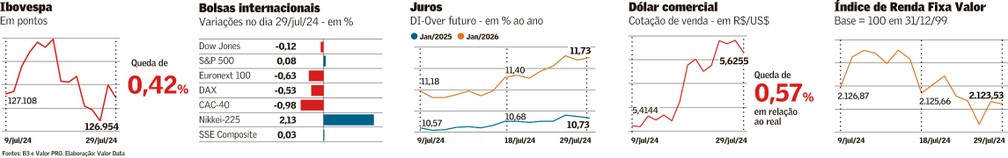 Nesse ambiente, e diante de um contexto que contempla uma situação fiscal pior, como mostraram os dados de junho, os juros futuros voltaram a subir. A taxa do DI para janeiro de 2026 avançou de 11,705% para 11,73%, enquanto a do DI para janeiro de 2029 passou de 12,15% para 12,18%.
