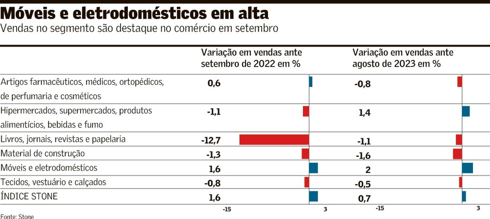 Após cinco quedas consecutivas, as vendas no varejo brasileiro subiram 1,6% em setembro ante setembro do ano passado, segundo o Índice de Atividade Econômica Stone Varejo, cujo resultado foi antecipado ao Valor. Em agosto, as vendas no indicador haviam caído ante 2,1% ante mesmo mês em 2022. Na comparação com agosto, as vendas subiram 0,7% em setembro.