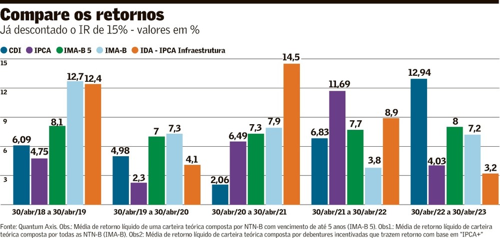 Samuel Ferrarezi, estrategista de investimentos do banco, lembra que o DI precisa estar em todas as carteiras, em maior ou menor fatia, conforme o perfil do investidor, mas, nesse momento, a indicação são os títulos ligados ao IPCA. “Quem está na marcação a mercado negativa são os papéis de inflação. Quanto maior o prazo, mais negativos ficaram. O triplo A pagava 0,3 ponto percentual acima do título público, subiu para de 0,40 a 0,50. E o duplo A, entre 0,70 e 0,80 ao ano”, diz.