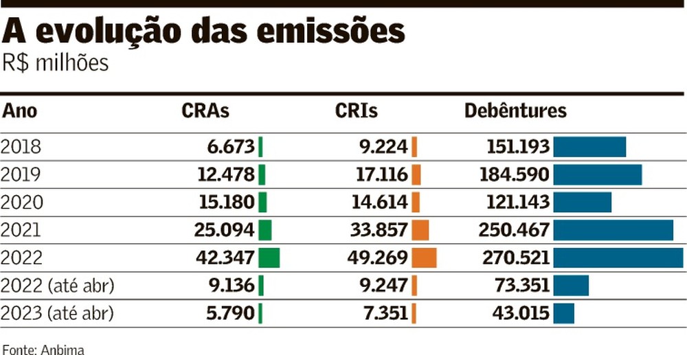 O volume de novas emissões ainda está bem abaixo do ano passado. Neste ano até abril, as debêntures somam R$ 43,015 bilhões (queda de 41% frente ao mesmo período de 2022); CRIs, R$ 7,3 bilhões (recuo de 20,5%); e CRAs, R$ 5,8 bilhões (37% menor). As LCIs e LCAs, por sua vez, seguem crescendo mas já apontam ritmo menor: as emissões de letras do agronegócio somaram R$ 87,4 bilhões entre janeiro e abril de 2022, crescimento de 123% frente a 2021. No mesmo período deste ano, somam R$ 138,7 bilhões, um avanço de 59% sobre 2022, segundo dados da Central de Custódia e Liquidação Financeira de Títulos (Cetip). Já as imobiliárias somaram R$ 58,2 bilhões no primeiro quadrimestre de 2022, expansão de 120% frente ao mesmo período de 2021. Neste ano, chegam a R$ 83,7 bilhões, aumento de 44% em relação a 2022.