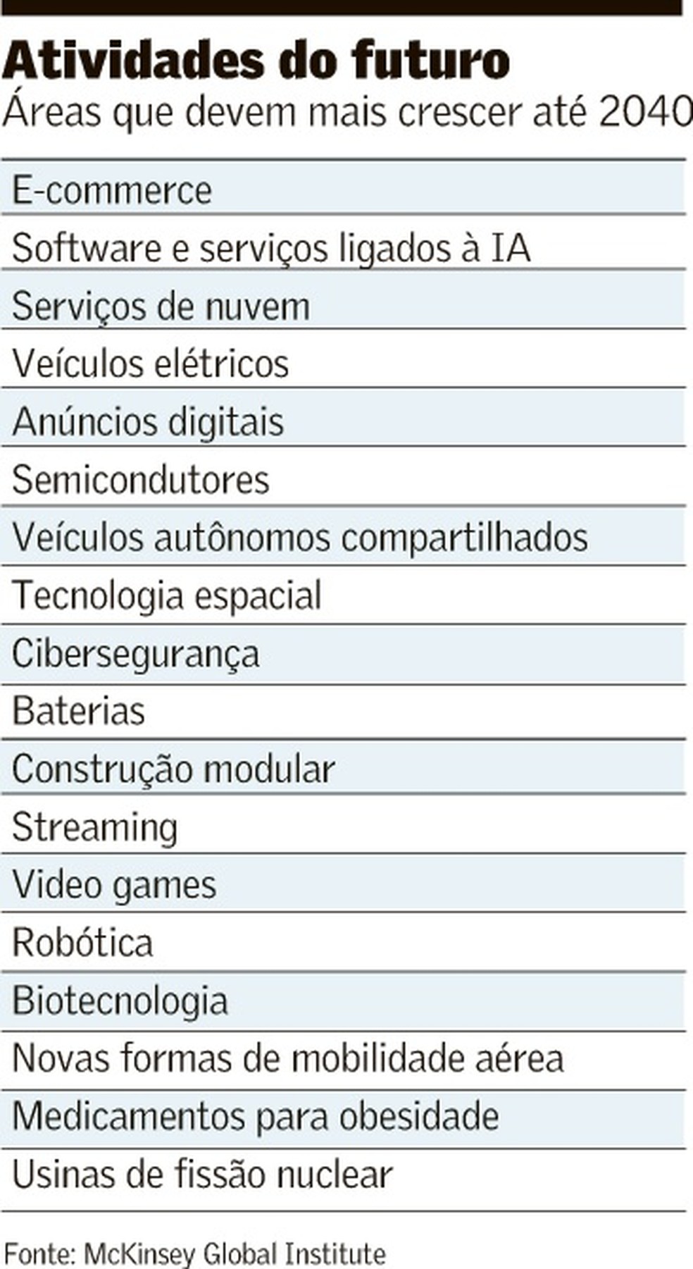 A McKinsey, que é uma das principais consultorias de negócios do mundo, olha para 2040 comparando com o que aconteceu entre 2005 e 2020. Nesse período, 12 áreas foram classificadas como arenas: e-commerce, serviços de nuvem, biofármacos, entre outras. Algumas dessas áreas crescerão ainda mais até 2040.