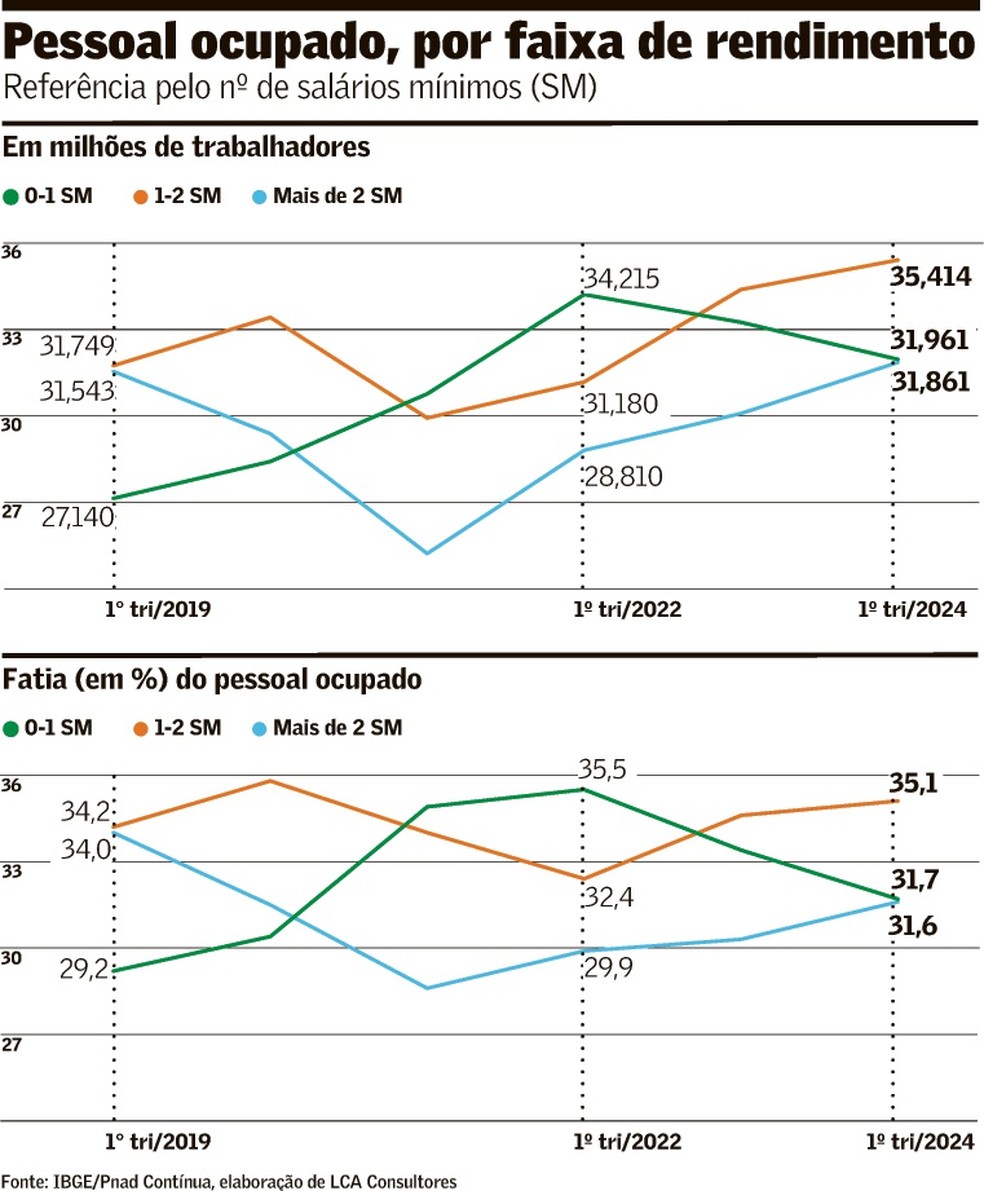 Os dados do mercado de trabalho mostram uma mudança na distribuição do pessoal ocupado por faixa de rendimentos nos últimos dois anos. A parcela dos trabalhadores com renda mensal entre zero e um salário mínimo caiu de 35,5% no primeiro trimestre de 2022 para 31,7% em igual período de 2024, mostra levantamento do economista Bruno Imaizumi, da LCA Consultores, a partir de microdados da Pesquisa Nacional por Amostra de Domicílios (PNAD) Contínua, do Instituto Brasileiro de Geografia e Estatística (IBGE).