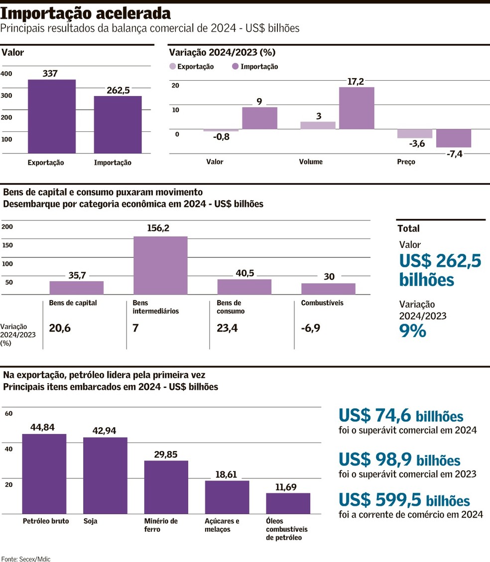Segundo a Secretaria de Comércio Exterior (Secex/Mdic), o superávit comercial em 2024 somou US$ 74,55 bilhões, com US$ 337 bilhões em exportações e US$ 262,48 bilhões em importações. Queda no preço das commodities e aumento das importações são fatores que levaram à redução do saldo.