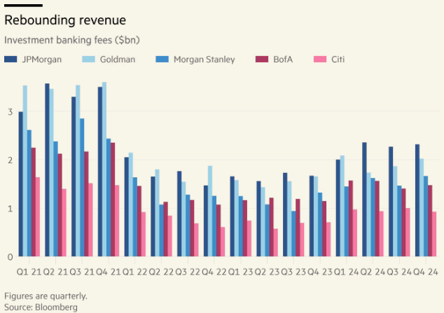 As taxas de serviços de investment banking devem ter aumentado quase 30% para os seis maiores bancos, chegando a cerca de US$ 8,4 bilhões, uma vez que tomadores corporativos aproveitaram uma queda temporária nas taxas de juros no outono para emitir dívida e um mercado de ações em alta levou a um aumento nas ofertas de ações, além de uma retomada modesta em fusões e aquisições.