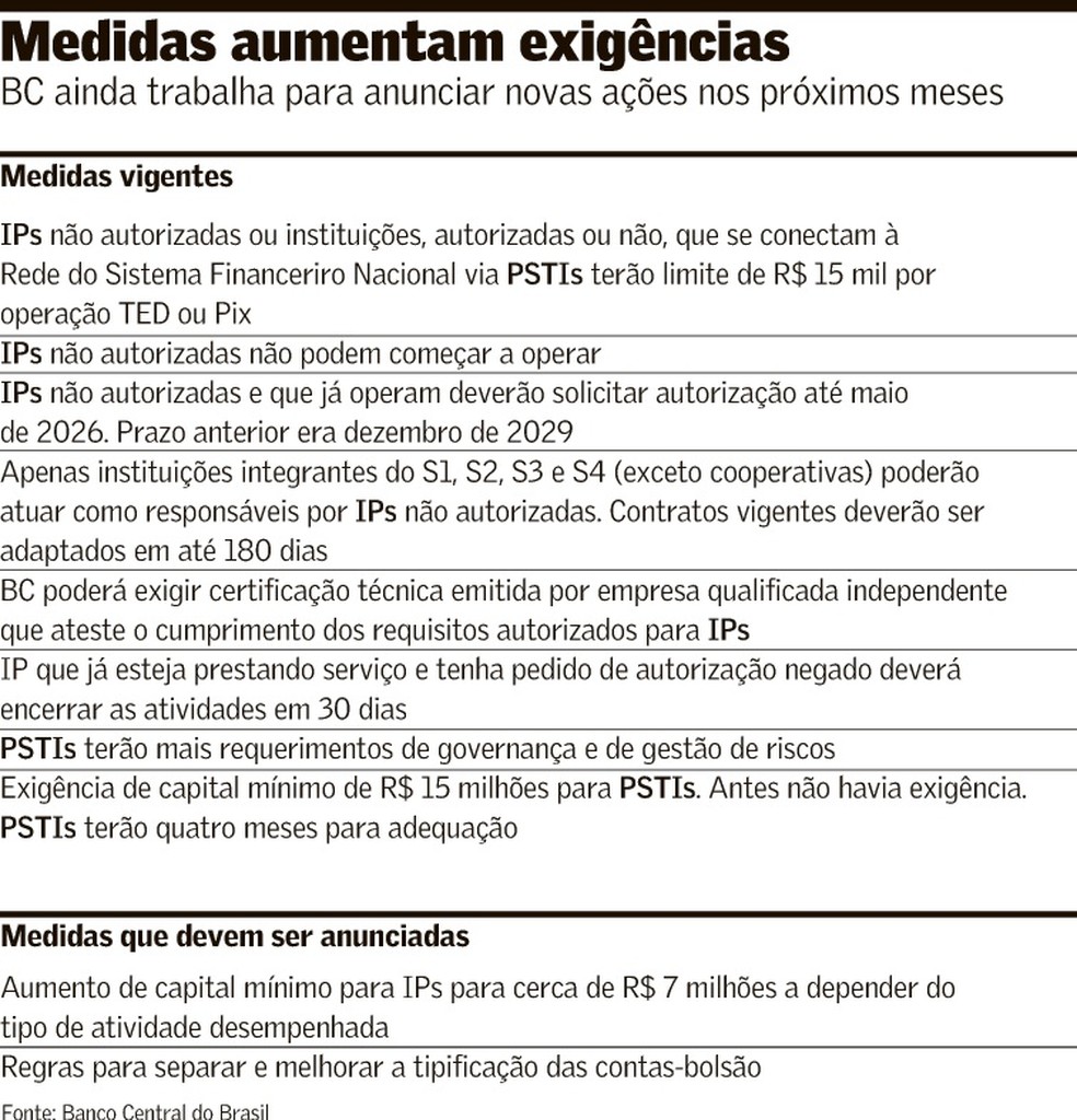 O BC reforçou a proibição para que instituições de pagamento operem sem autorização prévia e encurtou o prazo para que instituições não autorizadas peçam autorização. Antes, o pedido era escalonado, a depender do volume de movimentação financeira, até dezembro de 2029; agora passou para maio de 2026.