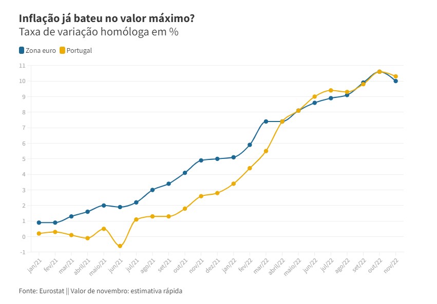 E, se estes dados são importantes para a decisão que Lagarde terá de anunciar esta quinta-feira, também não serão menos importantes os valores de novembro da inflação na zona euro. Depois de mais de dez meses em que a subida dos preços acelerou consecutivamente, em novembro, a taxa de inflação homóloga foi de ‘apenas’ 10%, um recuo face aos 10,6% de outubro.