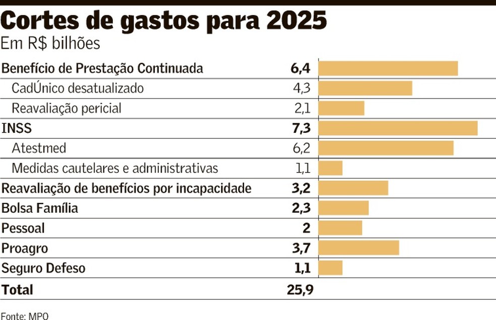 Com o pente-fino no seguro defeso (pago a pescadores artesanais no período em que a pesca é proibida), a economia esperada é de R$ 1,1 bilhão. Esse trabalho vai incluir recadastro dos beneficiários e cruzamento de dados para checagem dos critérios de elegibilidade. Por fim, o Proago terá uma economia de R$ 1,9 bilhão em 2025 com revisão de regras do programa.
