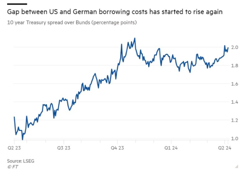 That has helped push the so-called spread, or gap, between benchmark 10-year German and US borrowing costs to 2 percentage points, close to the highest level since November.