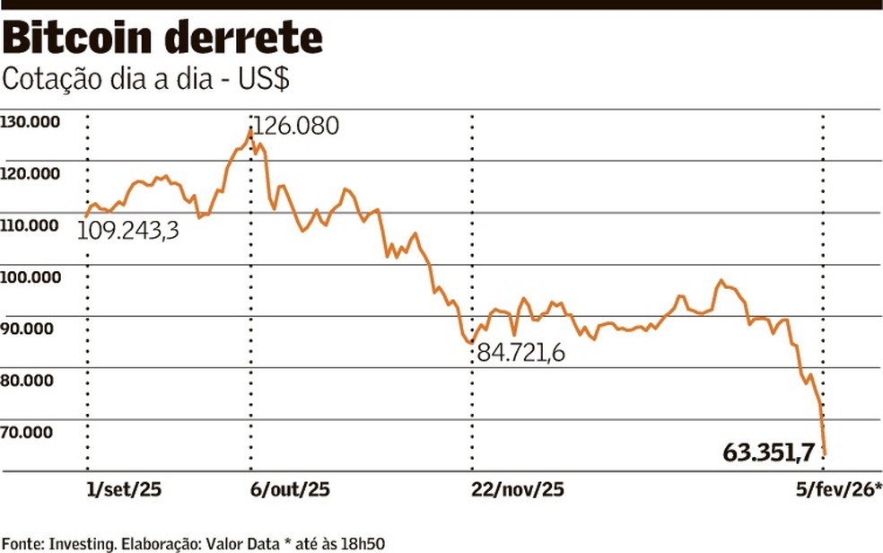 Desta vez, a queda do bitcoin começou com a grande liquidação de 10 de outubro, quando US$ 19 bilhões em posições no mercado de futuros foram encerradas em um “flash crash”. Os investidores comprados não tiveram mais força de jogar o preço para cima desde então, ficando à mercê dos vendidos. “Essas duas últimas semanas de queda são menos voltadas a notícias e mais a um sentimento de aversão a risco geral e desalavancagem. Quando isso acontece, o preço começa a cair muito mais pela emoção”, avalia Bazan. Ontem, o bitcoin caiu aos US$ 63 mil impactado no fim da tarde pela desvalorização das ações do setor de tecnologia. Um especialista que não quis ser identificado disse ao Valor que cripto está sendo influenciado pelo desempenho de tudo o que é tecnologia fora do segmento de inteligência artificial (IA).