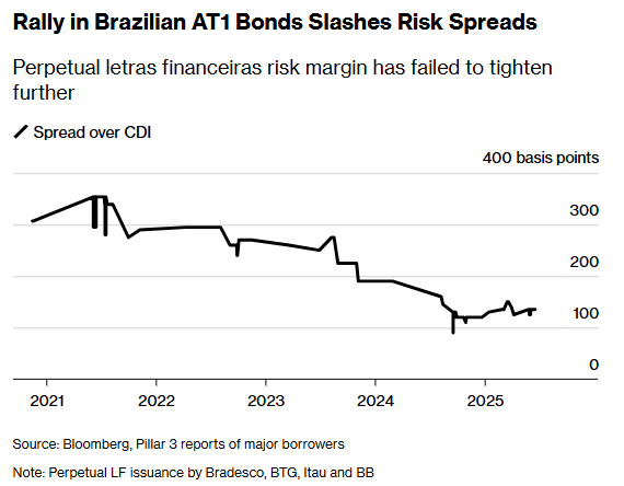 Os riscos, em vez disso, decorrem da natureza peculiar desses títulos, que não têm data de vencimento e possuem taxas de juros que são reajustadas periodicamente. Isso dá aos bancos a opção de, na prática, postergar seu resgate ao não exercer a opção de recomprar os títulos, algo que eles normalmente fazem na primeira data de call [data da opção de recompra].