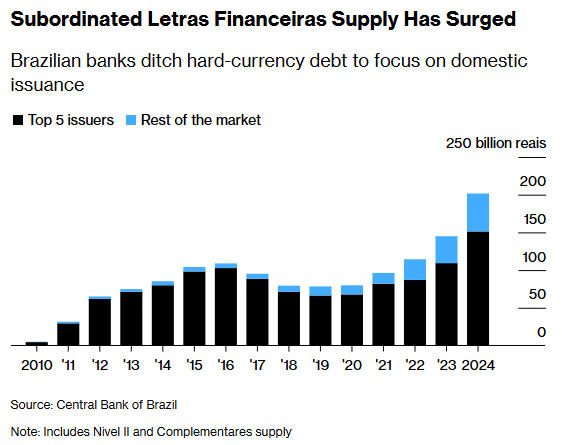 As emissões de títulos conhecidos como letras financeiras subordinadas — um tipo de dívida subordinada que os bancos usam para levantar capital para fins regulatórios — dispararam no mercado doméstico, à medida que brasileiros direcionam recursos para fundos locais de renda fixa, tornando mais barato para os bancos captar recursos localmente do que nos mercados internacionais.