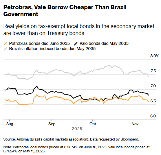 Dados da associação do mercado de capitais do Brasil, a Anbima, mostram que a petroleira estatal Petroleo Brasileiro SA e a gigante de mineração Vale SA emitiram recentemente debêntures isentas de imposto, como são chamados esses títulos locais, a um custo menor do que títulos de prazo semelhante emitidos pelo governo brasileiro.