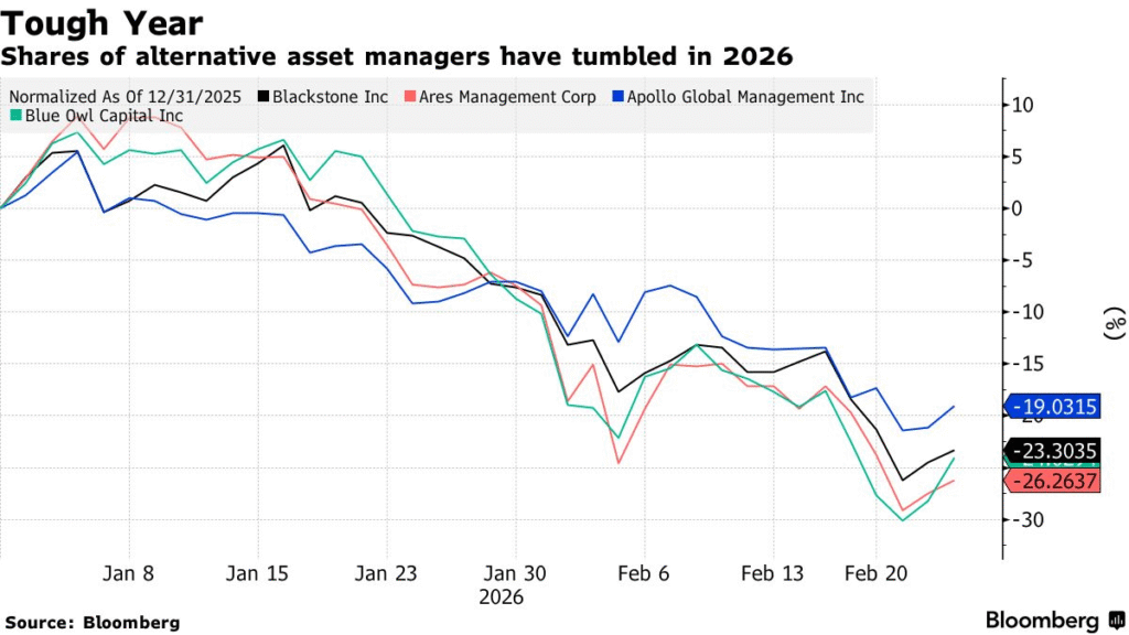 Enquanto a guerra de palavras continua, o dano de mercado é inegável. Somente neste ano, as ações da Ares Management Corp. despencaram 26%, a Blue Owl caiu 24%, a Blackstone Inc. recuou 23% e a Apollo Global Management Inc. tombou 19%, à medida que acionistas fogem de gestoras que despejaram recursos em private credit.