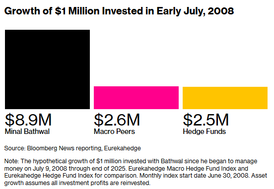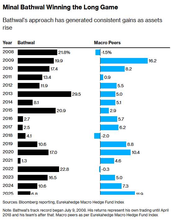 Bathwal permanece, construindo um histórico de vários anos que é notável entre fundos macro global — mesmo que isso ainda não o tenha transformado em um nome conhecido do grande público.