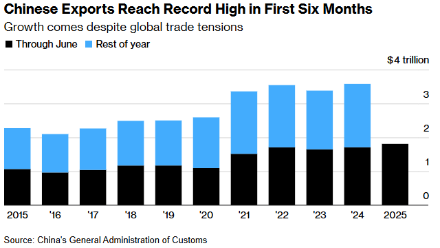 A China encerrou o primeiro semestre do ano com um superávit comercial recorde de aproximadamente US$ 586 bilhões, após as exportações para os Estados Unidos começarem a se estabilizar, com as fábricas superando a montanha-russa tarifária que abalou o comércio global.