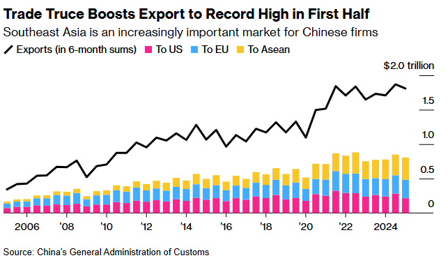 Os embarques para os EUA caíram 16,1% em relação ao ano anterior, após terem despencado mais de 34% em maio. As empresas chinesas conseguiram aumentar suas vendas em outros mercados para compensar a queda nas exportações aos EUA, com os embarques para os 10 países do Sudeste Asiático que compõem o grupo Asean saltando 17% no comparativo anual.