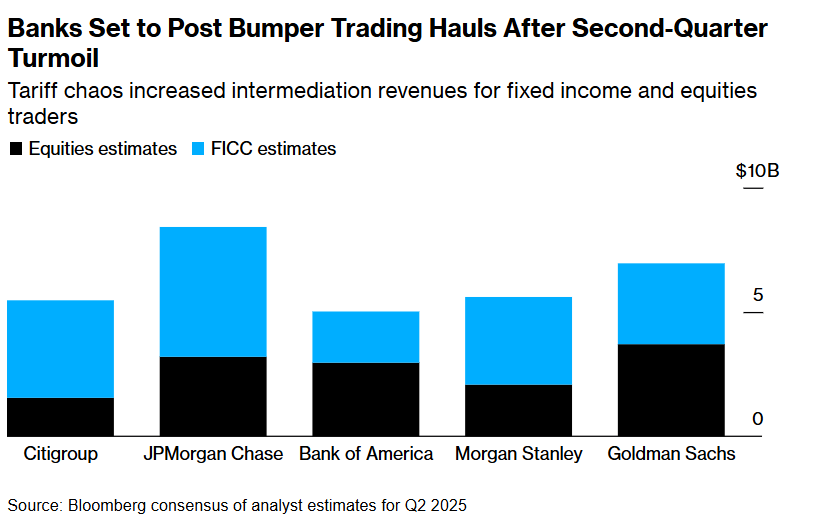 Os seis maiores bancos dos EUA divulgarão os resultados do segundo trimestre na próxima semana, e analistas preveem aumento nas receitas de negociação para todos eles, segundo dados compilados pela Bloomberg. Esse avanço decorre, em grande parte, de dias recordes de negociação registrados por algumas instituições após os anúncios tarifários apelidados de “Dia da Libertação” feitos por Trump em abril.