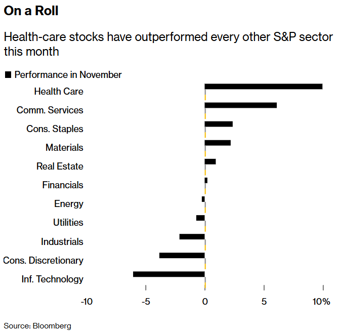 O S&P 500 Health Care Index subiu 10% até terça-feira, superando os outros 10 setores do índice de referência para ações dos EUA. O índice mais amplo recuou 1,1% no período. A Eli Lilly & Co. disparou 29% e se tornou a primeira empresa de saúde com uma avaliação de US$ 1 trilhão. Regeneron Pharmaceuticals Inc., Merck & Co. e Biogen Inc. registram alta de pelo menos 18% desde o fim de outubro.