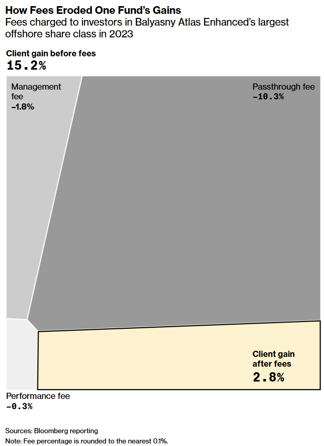 No ano passado, por exemplo, a ExodusPoint entregou aos investidores um ganho de 11% após cobrar 8,4 pontos percentuais em taxas de repasse, o que significou que os clientes receberam cerca de 57% dos lucros do ano. Os retornos, assim como os de Balyasny, foram descritos por pessoas com conhecimento direto dos números.