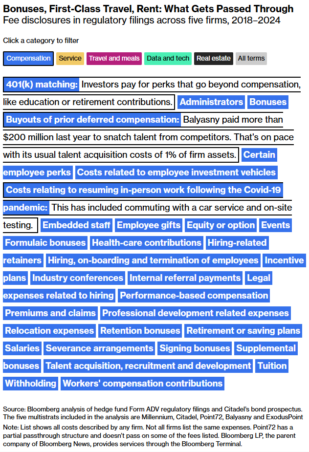 O nível de detalhe fornecido por cada hedge fund varia amplamente. Os registros anuais da Citadel e da Millennium têm consistentemente utilizado frases genéricas para descrever o que suas taxas de repasse abrangem — essencialmente afirmando que os investidores pagam todos os custos relacionados a um fundo. No outro extremo, a ExodusPoint enumera mais de 100 tipos de despesas.