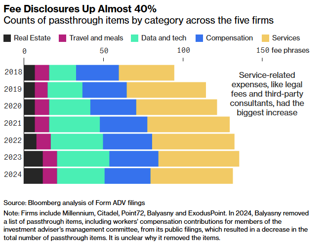 Uma análise da Bloomberg dos registros regulatórios do grupo mostra que as listas publicamente divulgadas de despesas elegíveis para repasse explodiram nos últimos anos. Há cerca de uma década, eles normalmente mencionavam categorias comuns como compensação, aluguel e computadores. Agora, algumas empresas especificam que as taxas podem incluir inteligência artificial, custos de conformidade, pagamentos por indicação interna, despesas com demissões e itens “abrangentes” — como “despesas extraordinárias ou não recorrentes.”