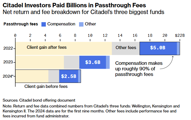 Desde o início de 2022 até setembro do ano passado, os três maiores fundos da Citadel acumularam quase US$ 12,5 bilhões em taxas de repasse, dos quais mais de US$ 11 bilhões foram destinados ao pagamento de compensação e benefícios aos funcionários.