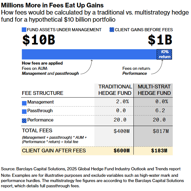 O resultado é que as taxas de repasse ultrapassam a tradicional estrutura “2 e 20” dos hedge funds — que há muito tempo é considerada alta. Segundo esse modelo, as empresas ficam com 2% dos ativos dos clientes para cobrir custos operacionais básicos, além de 20% dos lucros gerados. Alguns clientes dos multistrats estimam que, efetivamente, pagam taxas que variam de “7 e 20” a “15 e 20.”
