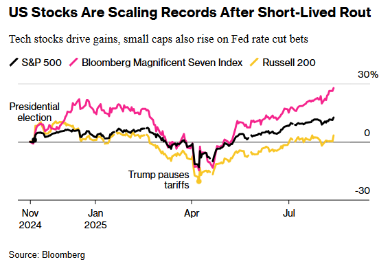 Os movimentos destacam o otimismo intenso que se desencadeou nos últimos meses. Os temores de uma guerra comercial iminente, que provocaram uma liquidação em abril, deram lugar à confiança de que a economia pode continuar avançando. O movimento mais recente foi impulsionado por renovadas expectativas de cortes iminentes de juros nos EUA.
