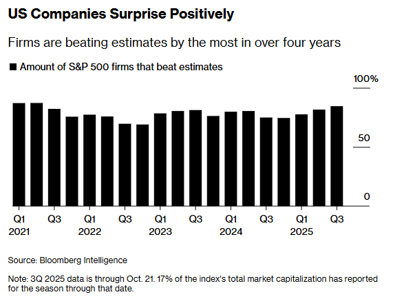 Cerca de 85% das companhias do S&P 500 que já divulgaram os resultados do terceiro trimestre superaram as estimativas de lucro, a caminho do melhor desempenho desde 2021, de acordo com dados compilados pela Bloomberg Intelligence.