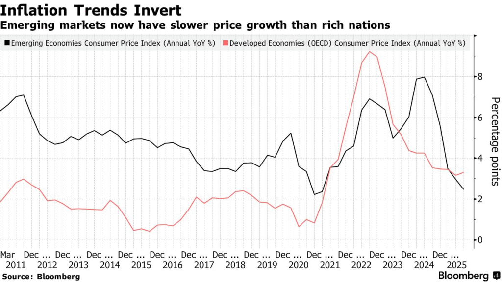 O que empolga os investidores é uma desaceleração acentuada da inflação. Por dois trimestres consecutivos, os preços ao consumidor em mercados emergentes têm crescido mais lentamente do que nas economias desenvolvidas, segundo índices da Bloomberg. Essa inversão não era vista há pelo menos três décadas e meia — exceto por um episódio durante os anos voláteis da pandemia — e pode se revelar um bonança para o mercado de títulos.