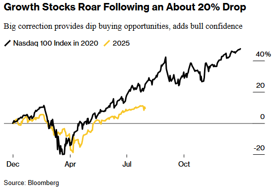 As ações nos Estados Unidos estão próximas de máximas históricas, impulsionadas por fortes lucros corporativos e apostas em cortes de juros, o que ofusca preocupações sobre o impacto de tarifas amplas. Investidores também voltaram a comprar ações de grandes empresas de tecnologia e se reaproximaram da tese de investimento em IA, mesmo com os dados sinalizando que o crescimento econômico pode estar desacelerando.