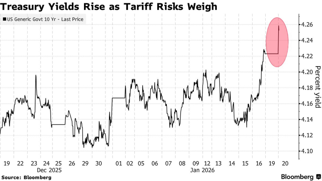 Os Treasuries [títulos do Tesouro dos EUA] se juntaram, na terça-feira, a uma liquidação em bonds globais, à medida que a escalada das tensões comerciais, impulsionada por tarifas propostas pelos EUA relacionadas à Groenlândia, enfraqueceu a demanda por ativos americanos.