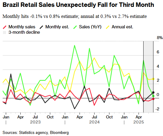 As vendas no varejo do Brasil caíram inesperadamente em junho, marcando a terceira queda consecutiva e o mais recente sinal de que a maior economia da América Latina está desacelerando.