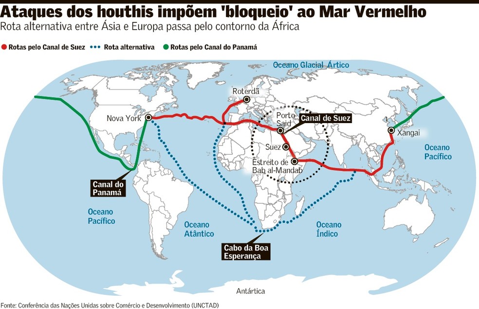 Contando apenas o período entre os primeiros ataques com drones dos houthis no Estreito de Bab el-Mandeb, em novembro, e fim fevereiro, o comércio através do Canal de Suez caiu pela metade, de 38 milhões de toneladas para 16 milhões de toneladas, informou o FMI, naquela que é a principal rota comercial entre a Ásia e a Europa.