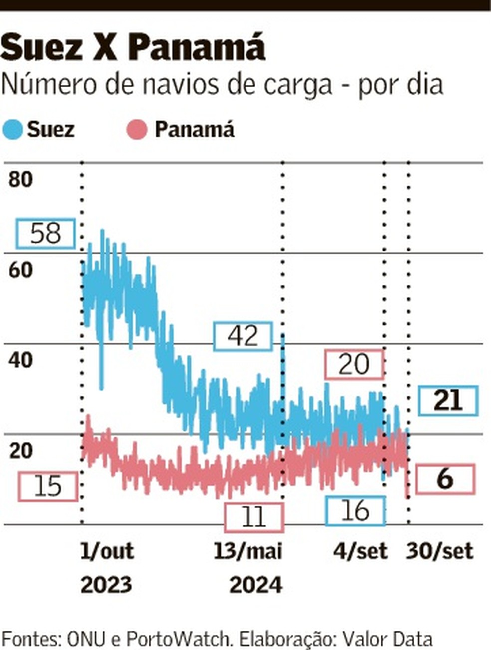 “Normalmente se tinha em média 60 navios por dia passado pelo Canal de Suez e cerca de 30 navios no máximo passando pelo Canal do Panamá”, afirma Jan Hoffmann, especialista em comércio na Conferência das Nações Unidas sobre Comércio e Desenvolvimento (Unctad, na sigla em inglês). “Mas agora pela primeira vez desde que temos dados, pelo menos neste século, tivemos dias com mais trânsitos pelo Panamá do que pelo Suez por conta da crise causada pelos houthis.”